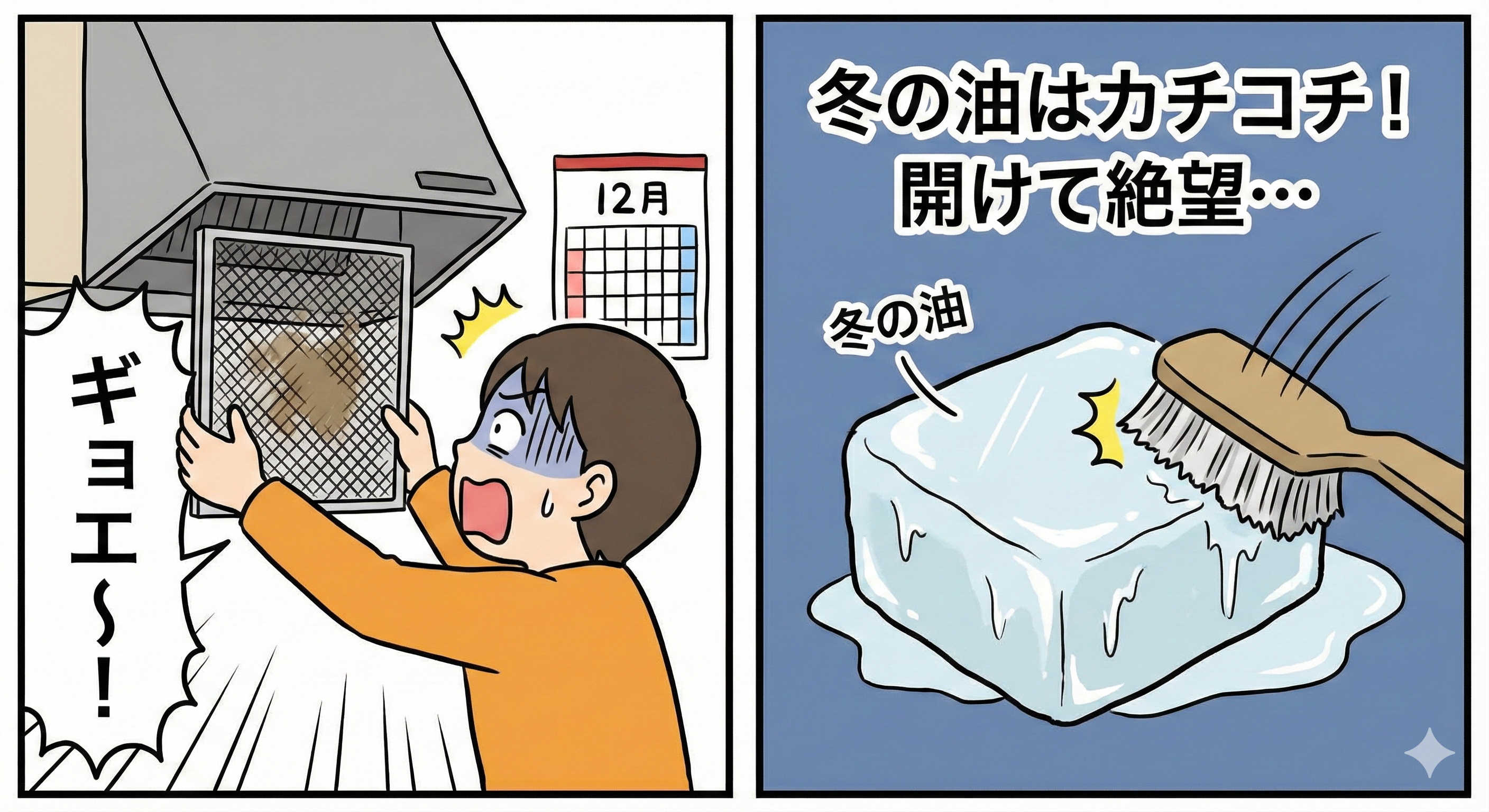 「冬の油汚れは、冷えて石のように固まっているから」です。