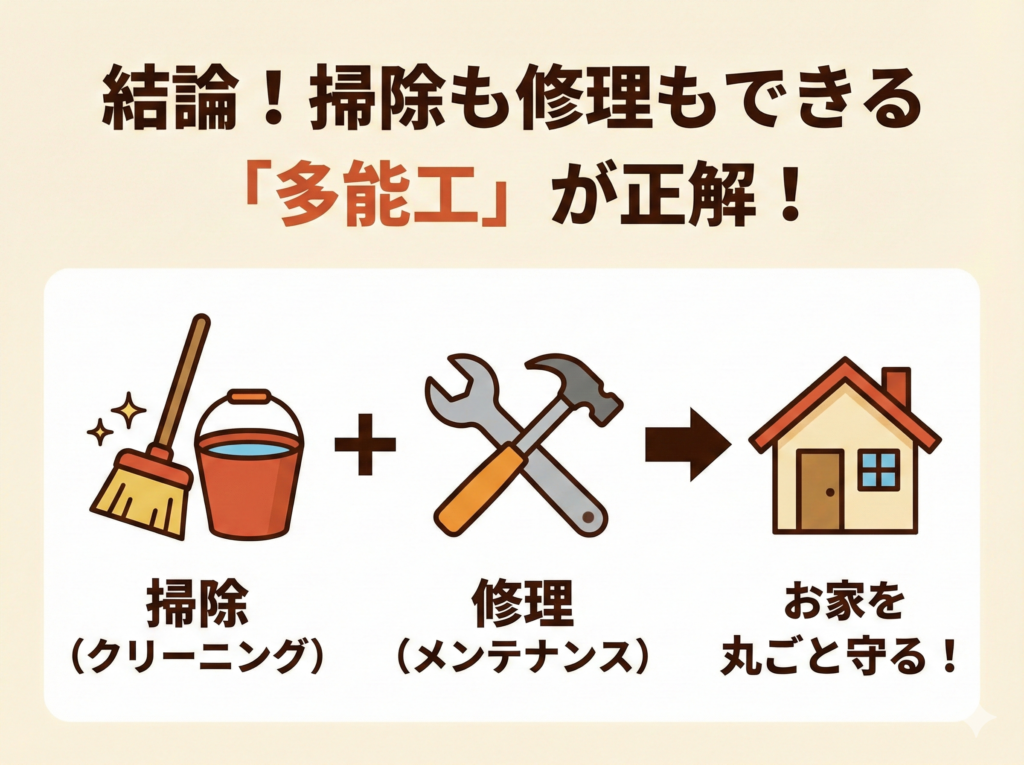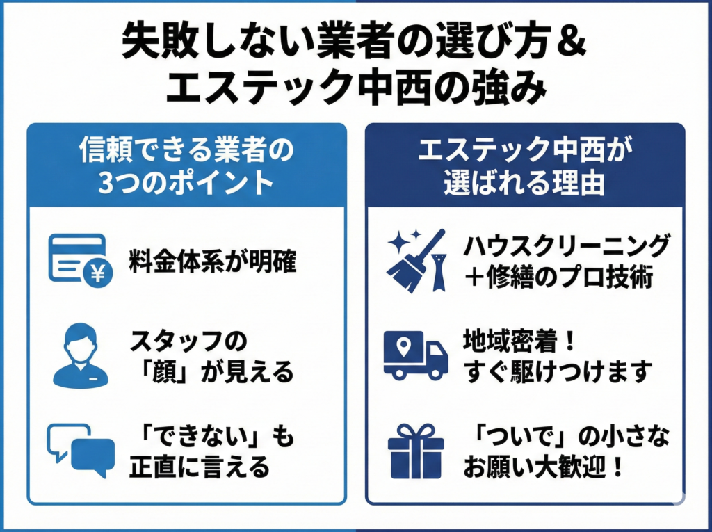 単なる「掃除屋」ではなく、お家の構造を理解している「修繕もできる専門家」に見てもらうことが、結果的に一番の節約になり、安心につながるのです。