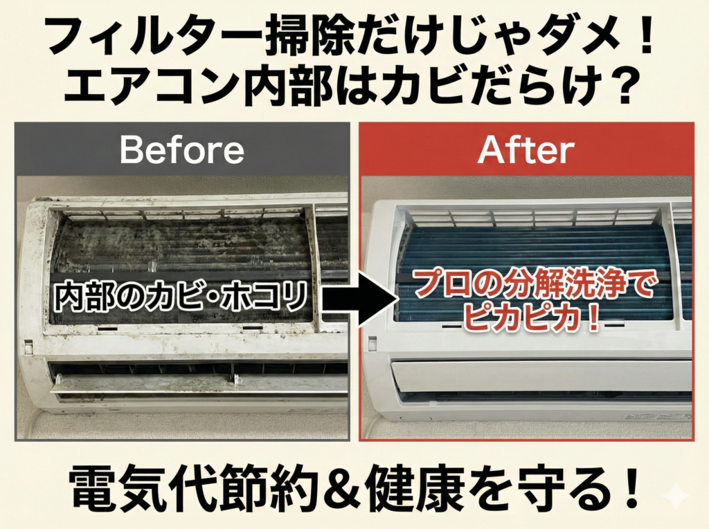 特に福岡は湿度が高い時期も多く、エアコン内部はカビの温床になりやすい地域です。
