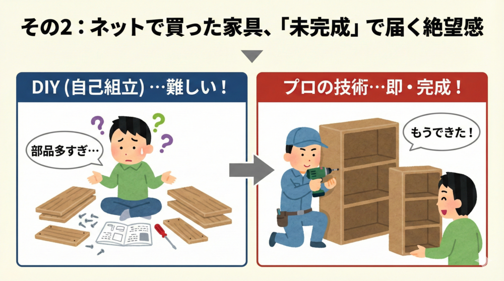 - ネット家具の組み立ては、プロに任せて時間と体力を節約。