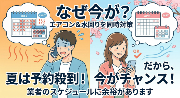 「お家を清潔に保ち、夏のトラブルを防ぐなら、『今の時期』にエアコンと水回りのお手入れをプロに任せるのが一番の正解です!」