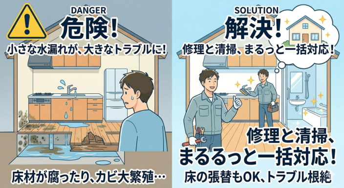 でも、ちょっとした水漏れを放置すると、床材が腐ってしまったり、カビが大繁殖したりと、後々「床の張替」などの大掛かりな工事が必要になることも!